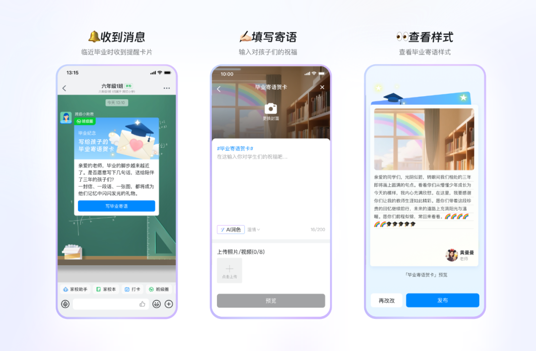 六年级、初三、高三的班主任可以为学生写下毕业寄语,也可以选择使用AI润色。寄语支持上传照片或视频,图文结合,留下有温度的专属纪念。完成后可一键发送至钉钉班级圈和班级群,为毕业增添一份特别的仪式感。