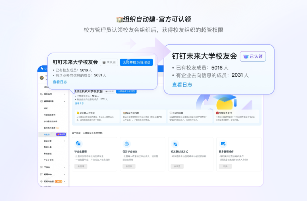 管理员在后台删除毕业班通讯录时,钉钉会自动创建校友会组织,并会把删除的毕业生平移到校友会,管理员只需在钉钉后台领取便可激活认领该校友会组织。