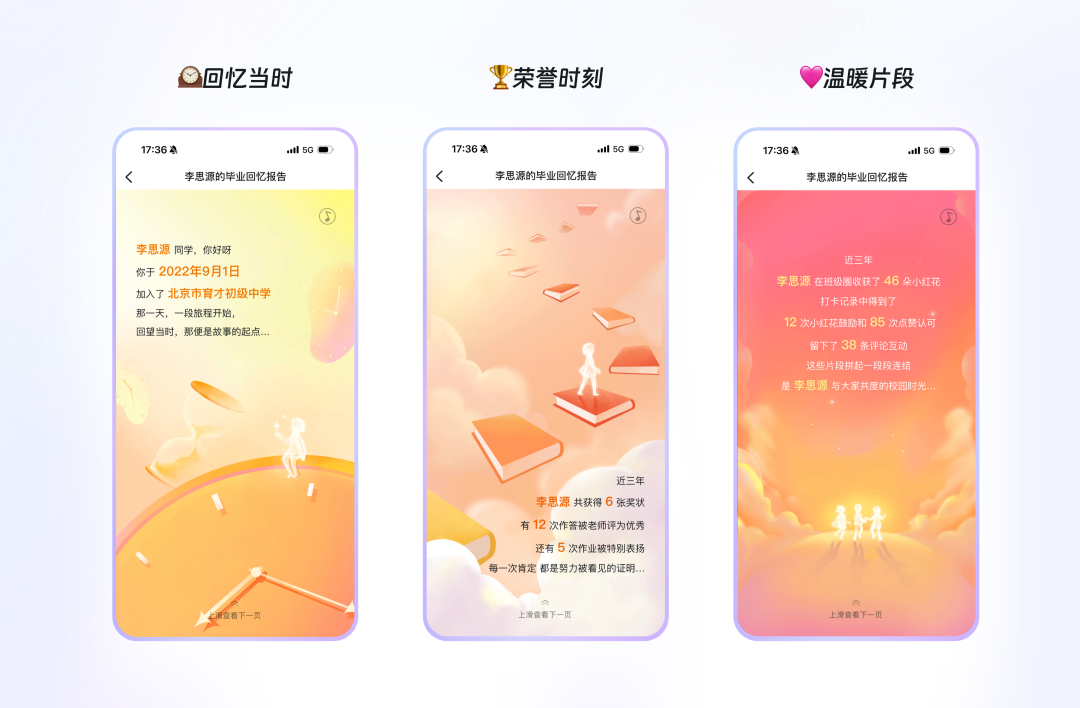 当管理员在钉钉后台对六年级、初三、高三毕业班级群操作毕业后,毕业班的学生将会收到一份毕业回忆报告,该报告由AI汇总生成,内容来自该学生过去在钉钉上的家校本、好习惯打卡、班级树、班级圈等场景沉淀的珍贵记录。
