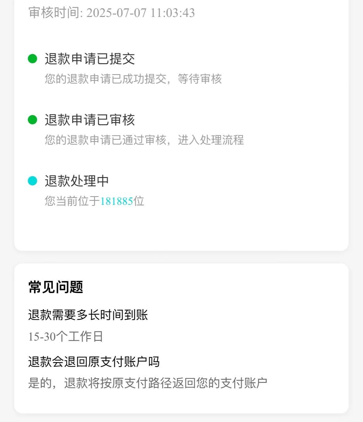 随后,记者收到罗马仕客服电话,客服表示是有人工客服的,可通过订单与客服沟通,后续有专人处理。对于有消费者退款进度排到了十几万位的问题,她表示,确实有很多人需要退款,退款一般是15-30个工作日,“我们审核完成后都是大批量的转账。”