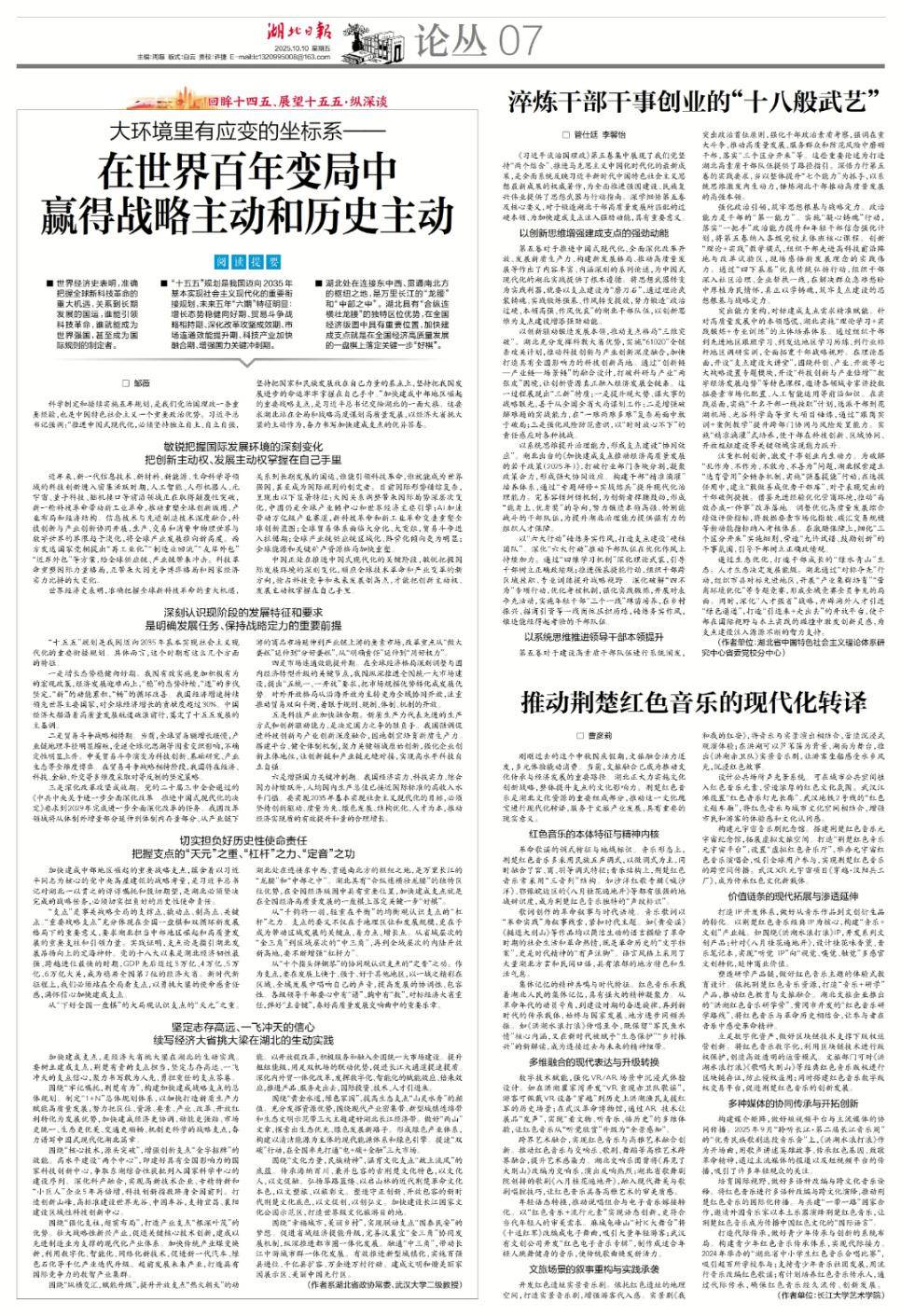 科学制定和接续实施五年规划,是我们党治国理政一条重要经验,也是中国特色社会主义一个重要政治优势。习近平总书记强调:“推进中国式现代化,必须坚持独立自主、自立自强,坚持把国家和民族发展放在自己力量的基点上,坚持把我国发展进步的命运牢牢掌握在自己手中。”加快建成中部地区崛起的重要战略支点,是习近平总书记交给湖北的一面大旗。这要求湖北站在全局和战略高度谋划高质量发展,以经济大省挑大梁的主动作为,奋力书写加快建成支点的优异答卷。